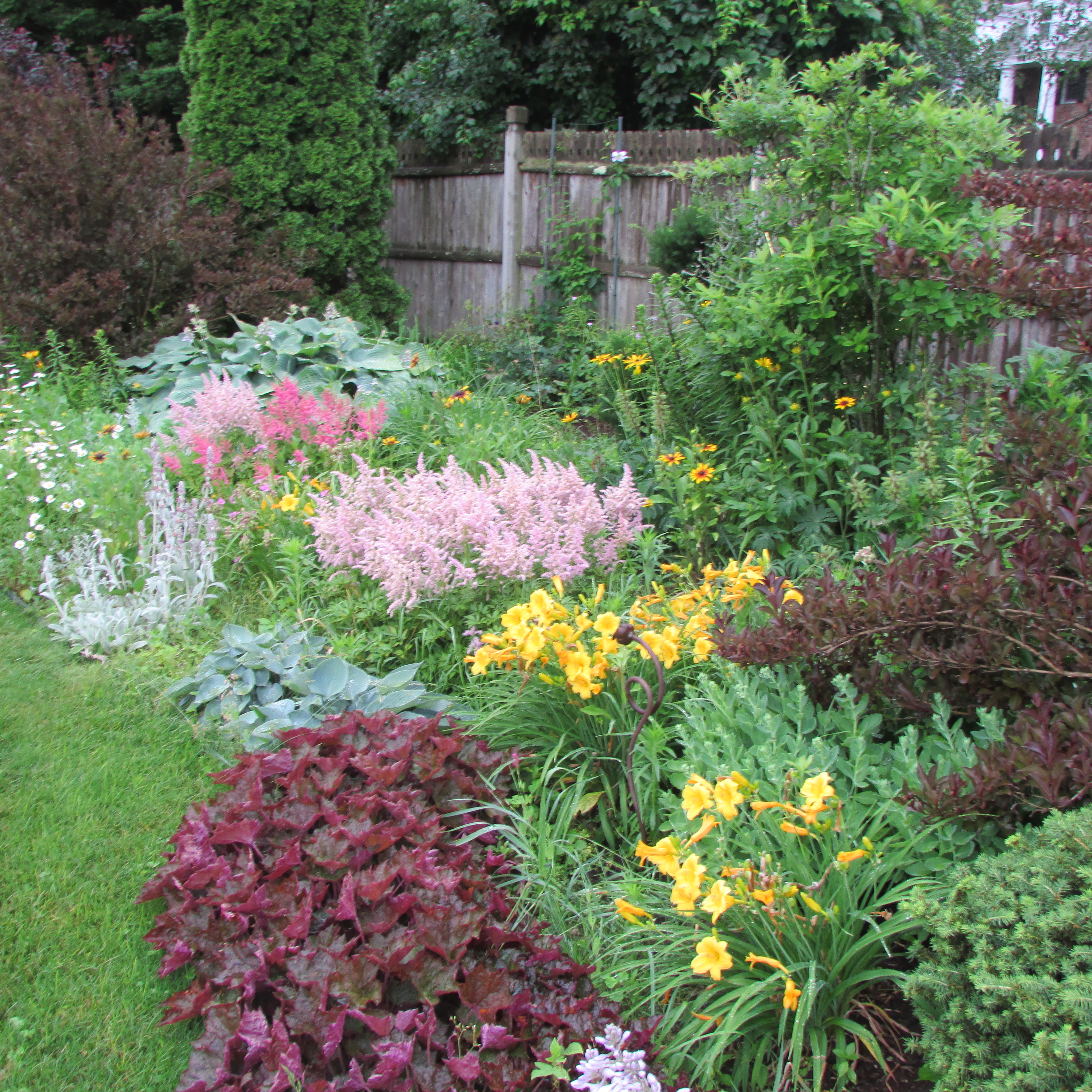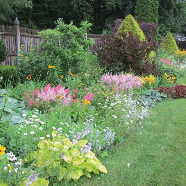 Now we’re out back looking at the garden of “Needs Weeding” which will next have its soil in spots also amended, major weeding done and planted, so it looks presentable like out front does.   Here you see astilbe, wild daises, stella de oro daylilies and different colors of foliage doing their thing.  Hopefully the rain and forecast-ed hot weather will pass so I can get the job done.