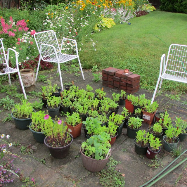 More photos of out back and pots of zinnias, Mexican sunflowers, and cosmos that I started from seed to be planted in the back garden.