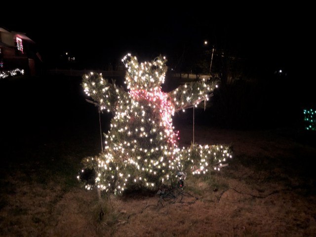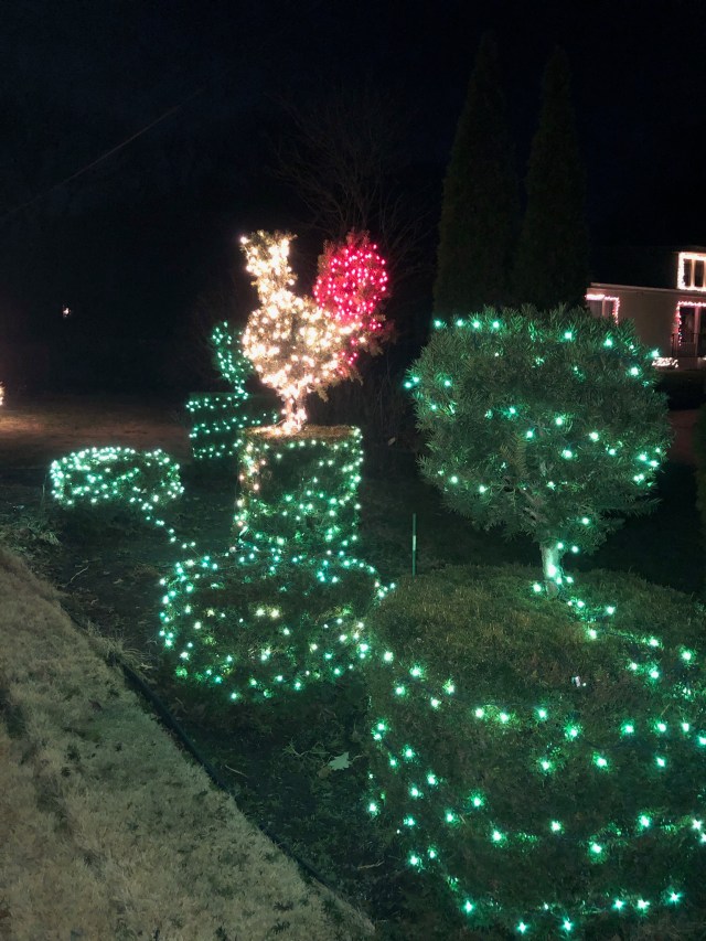 The two photos that make up the cover pictures for this blog article, are of the topiary bear and chicken that are here at Whimsey Hill House on my front lawn, that I’ve lit for Christmas.