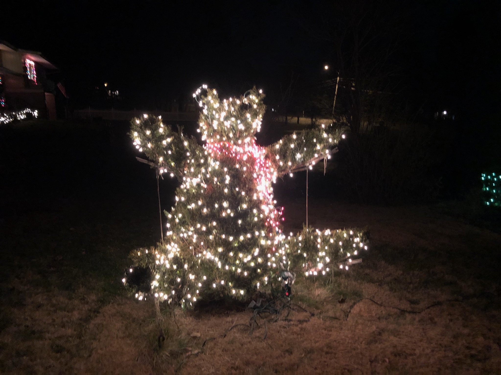 The two photos that make up the cover pictures for this blog article, are of the topiary bear and chicken that are here at Whimsey Hill House on my front lawn, that I’ve lit for Christmas.