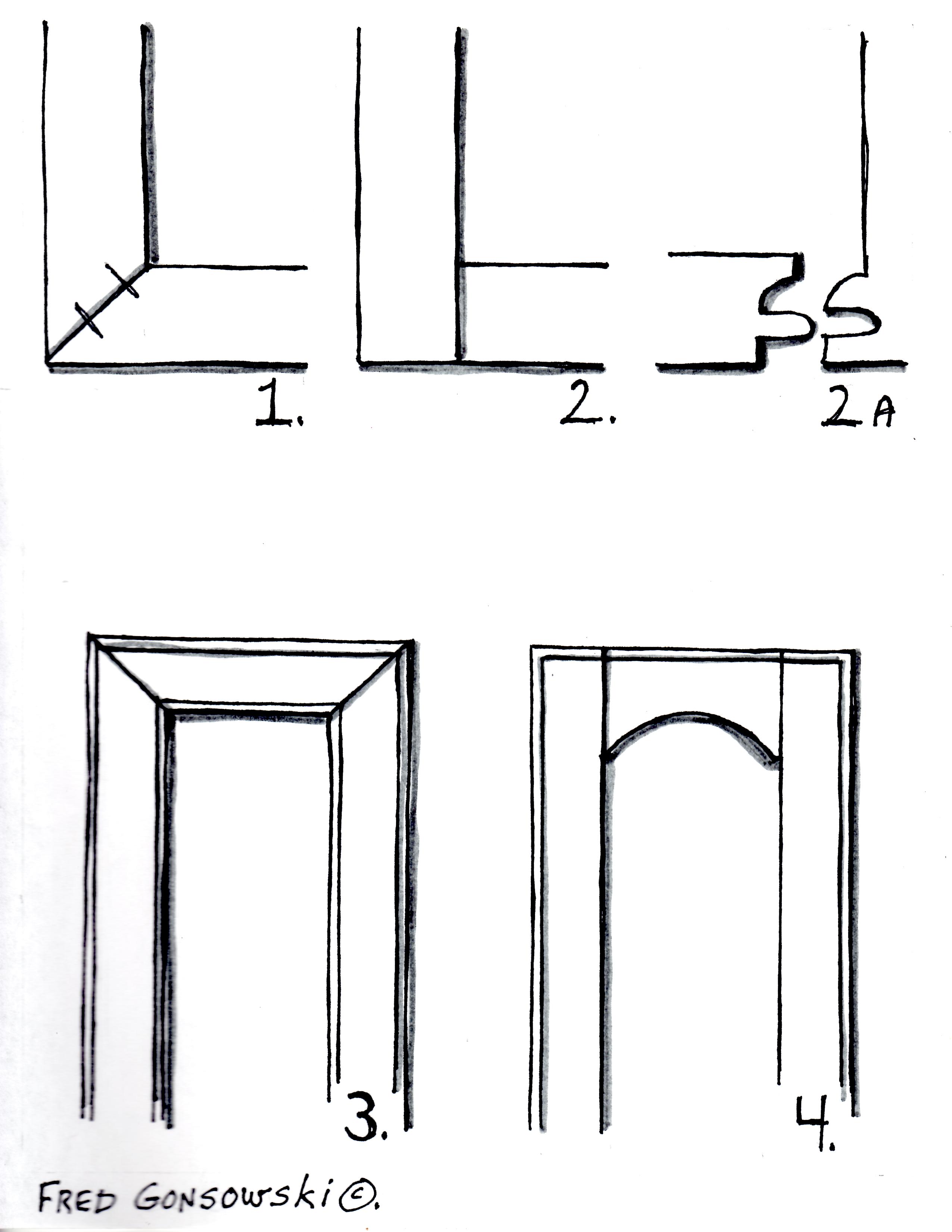 Illustration #3 shows a kind of Shaker cabinet door held together using Miter joinery, illustration #4 shows an arched top cabinet door with Mortise and Tenon joinery.